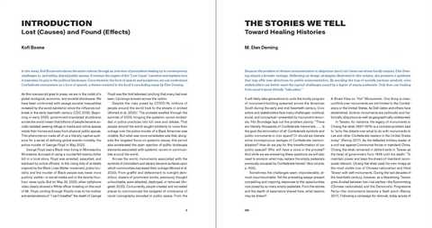 -          Part III: Action, Reflection, Healing features essays drawing out transferable tactics, principles, and frameworks from previous perspectives and designs. This section considers broader systems within which local public spaces perform, including grassroots cultural, economic, and political entities charged with preserving and effecting changes in the built environment. These reflections provide orientation, impetus, and direction for designers, planners, funders, and others working towards a more inclusive and vibrant local public landscape. Elen Deming concludes Part III with “Stories We Tell: Toward Healing History(s),” distilling overarching ideas into a framework for action by designers, bringing the book full circle to emphasize the power of narratives in shaping social and spatial systems.