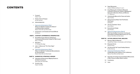 The volume is organized into three parts with visual essays interspersed. Tania Allen and Sara Queen provide four innovative visual essays (plates) exploring specific data-driven aspects of Confederate monumentation.