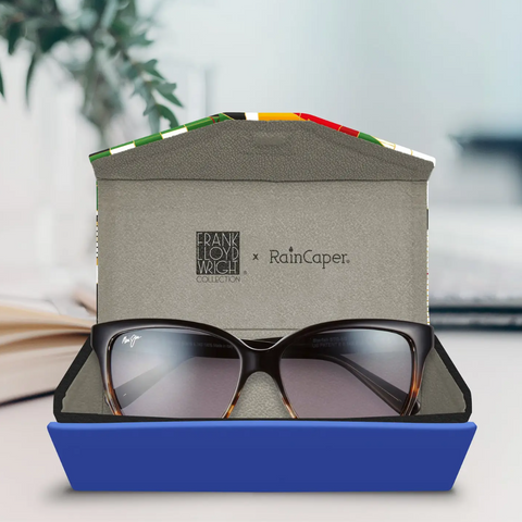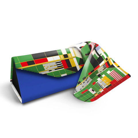 Brilliantly simple folding triangle case fits sunglasses and eyeglasses of all sizes. Matt, soft touch vegan leather features a stunning overall art print. Case is sturdy, yet folds flat for compact storage. Ultra-soft lining keeps glasses from scratching.
