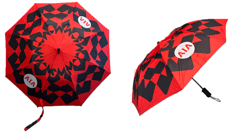 A geometric patterned umbrella representing the AIA logo. This single-canopy, auto-open umbrella is the perfect, lightweight travel accessory to stock your bag. The convenient loop handle makes carrying the umbrella effortless.