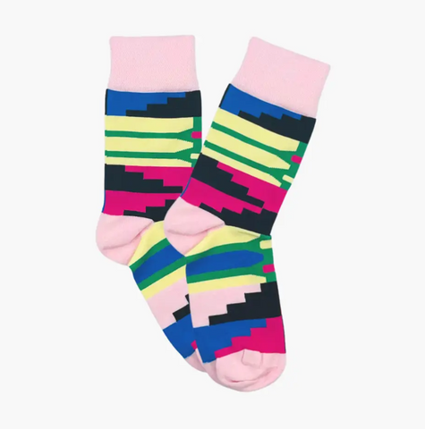 Discover the Kente Pink Socks, where familiar kente patterns are spun with bright, contemporary colors. With a soft pink and bold accent tones, the Kente Pink Socks are perfect for every occasion. Pair them with a casual, sporty, or business formal outfit – these socks will compliment any ensemble with an artistic touch. Afropop Socks are a fun and stylish way for people from all backgrounds to enjoy unique African fashion.